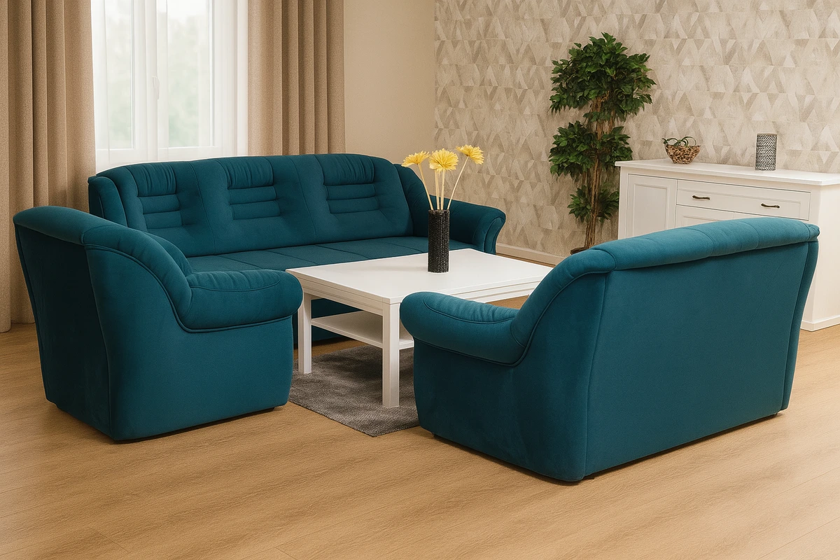 TDF Garnitura BUENO predstavlja savršen spoj elegancije i praktičnosti. Prostrani trosjed sa dekorativnim drvenim detaljima i funkcijom razvlačenja nudi udobnost za svakodnevno korištenje i dodatni ležaj za goste. Kompaktan dvosjed opremljen je mehanizmom za razvlačenje i kutijom za odlaganje, idealan za manje prostore. Klasična fotelja sa zaobljenim naslonima i kombinacijom tkanine i drveta donosi završni pečat elegancije i potpune udobnosti vašem prostoru.