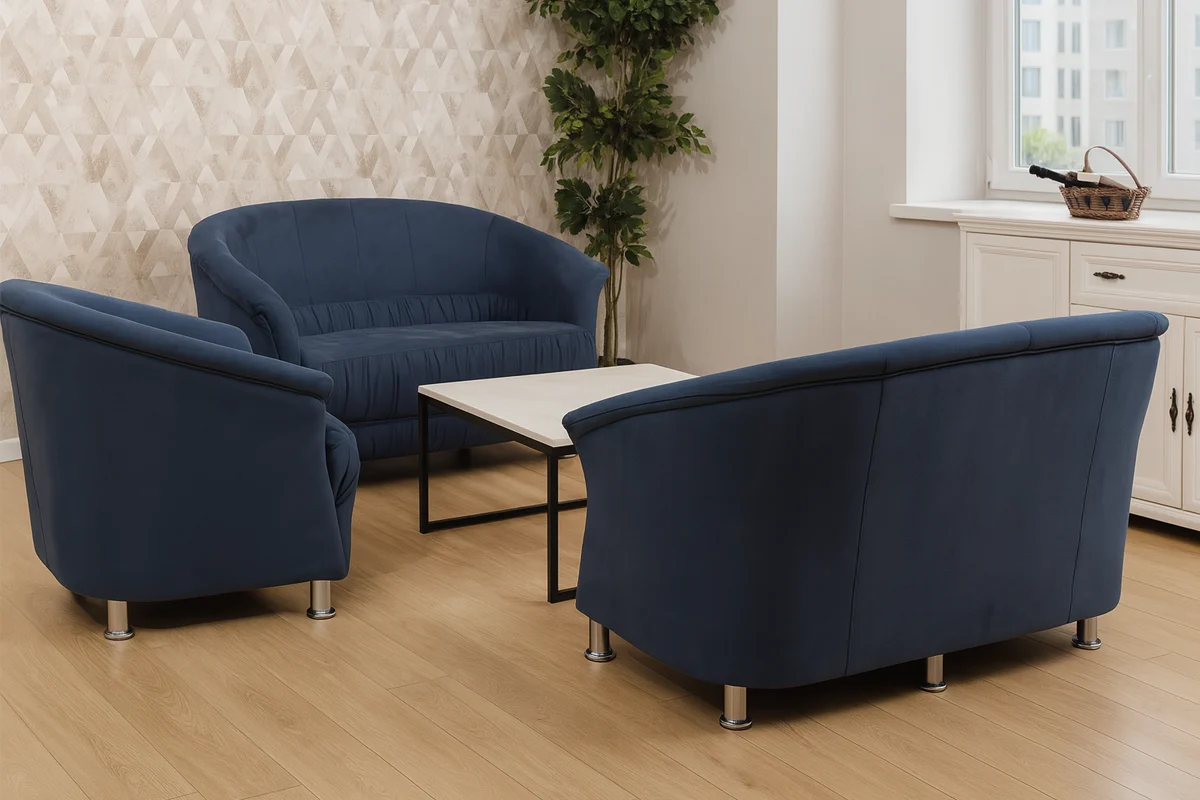 Garnitura KALA donosi savršen balans udobnosti i stila, osmišljena za poslovne prostore kojima je potreban sofisticiran, ali praktičan namještaj. Sastoji se od dva komada fotelja i jednog dvosjeda, što je čini idealnim izborom za čekaonice, kozmetičke salone, ordinacije, kancelarije ili druge profesionalne enterijere. Zahvaljujući kompaktnim dimenzijama i elegantno zaobljenim linijama, KALA se lako uklapa u različite prostore, ne narušavajući funkcionalnost ni estetiku prostora. Mekano sjedište, udobni nasloni i metalne nogice osiguravaju stabilnost, dugotrajnost i maksimalan komfor za vaše klijente ili posjetioce.