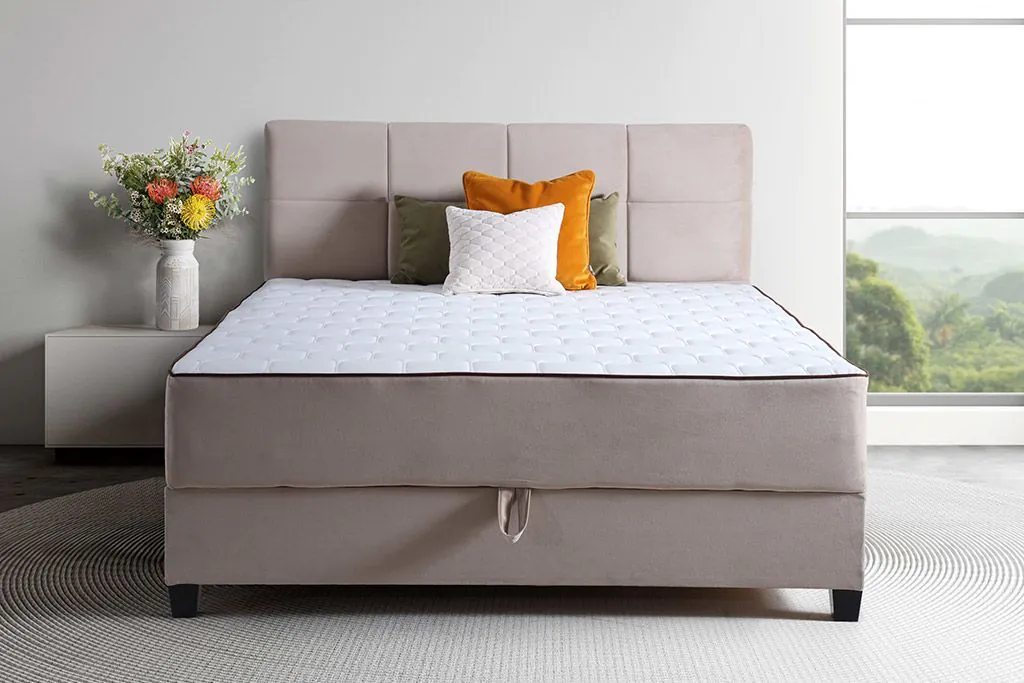 – Otvara se sistemom podizanja na makaze – Poseduje sanduk za posteljinu – Konstrucija puno drvo + univer – Ležeći deo sunđer PU 28kg/m3+žičano jezgro – Ukrasni jastuci nisu uključeni u cenu