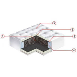 Debljina: 18cm 1. Žičano bonnel jezgro 2. Tvrdo-presani filc 500 gr/m2 3. PU pjena 25 PT 4. Bočna ojačanja 5. Štepana presvlaka