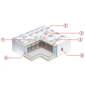 Debljina: 21cm 1. Žičano bonnel jezgro 2. Tvrdo-presani filc 600 gr/m2 3. PU pjena 25 PT 4. Bočna pojačanja 5. Štepana presvlaka 6. Ventilator