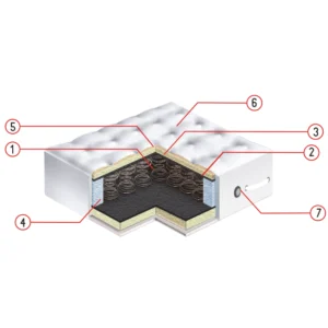 Debljina: 25cm 1. Žičano bonnel jezgro 2. Tvrdo-presani filc 7000 gr/m2 3. PU pjena 25 PT 4. Bočna pojačanja 5. Termo izolator ljeto/zima 6. Štepana presvlaka – pletenina 7. Ventilator i ručke