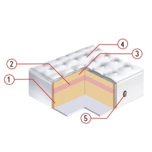 Debljina: 21cm 1. PU pjena 35 PT 2. HR pjena (visoko elastična) 3. MEMORY pjena 4. Štepana navlaka – pletenina 5. Ventilator