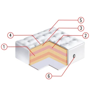 Debljina: 25cm 1. PU pjena 35 PT 2. HR pjena – obostrano 3. MEMORY pjena – obostrano 4. Termo izolator ljeto/zima 5. Štepana presvlaka – pletenina 6. Ventilator