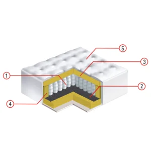 Debljina: 23cm 1. Džepičasto jezgro 2. Tvrdo-presani filc 600 gr/m2 3. HR pjena 35 T 4. Bočna pojačanja 5. Skidiva Štepana presvlaka