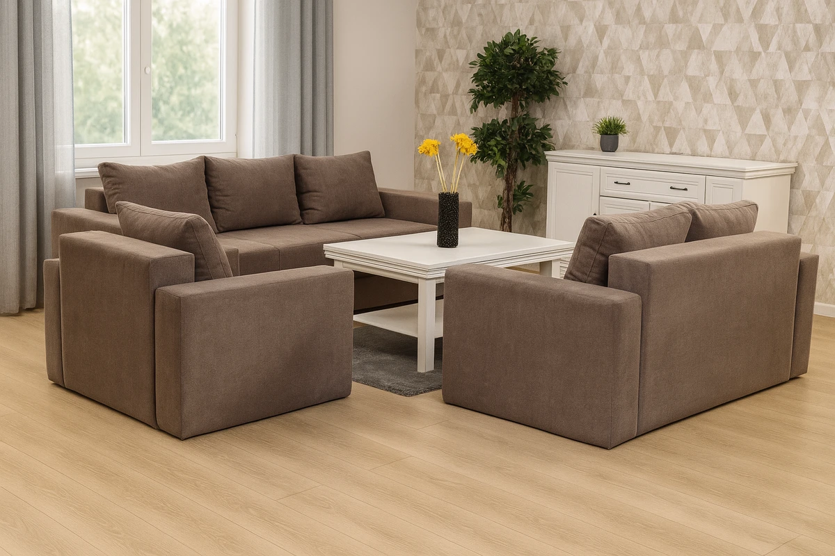 TDF NINA garnitura kombinuje jednostavne linije, tople nijanse i visok nivo udobnosti, čineći je savršenim izborom za svaki dom. Trosjed sa uklonjivim jastucima pruža fleksibilnost i lako održavanje, dok dvosjed sa funkcijom razvlačenja u ležaj omogućava dodatni prostor za spavanje. Kompaktna fotelja upotpunjuje set, nudeći intimni kutak za opuštanje. Zahvaljujući praktičnim dimenzijama i čistom dizajnu, TDF NINA se lako uklapa u moderne i klasične enterijere, bilo da želite popuniti manji dnevni boravak ili prostrani salon.